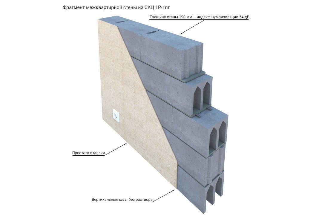 Перегородочный блок СКЦ-1Р-1ПГК с добавлением керамзита идеально подходит для возведения межквартирных стен в жилых домах всех типов. Высокие показатели шумоизоляции — до 52 дБ при оштукатуривании — делают его отличным выбором для строительства в условиях плотной городской застройки Москвы. Камень обеспечивает надёжную звукоизоляцию и комфорт в каждом помещении.