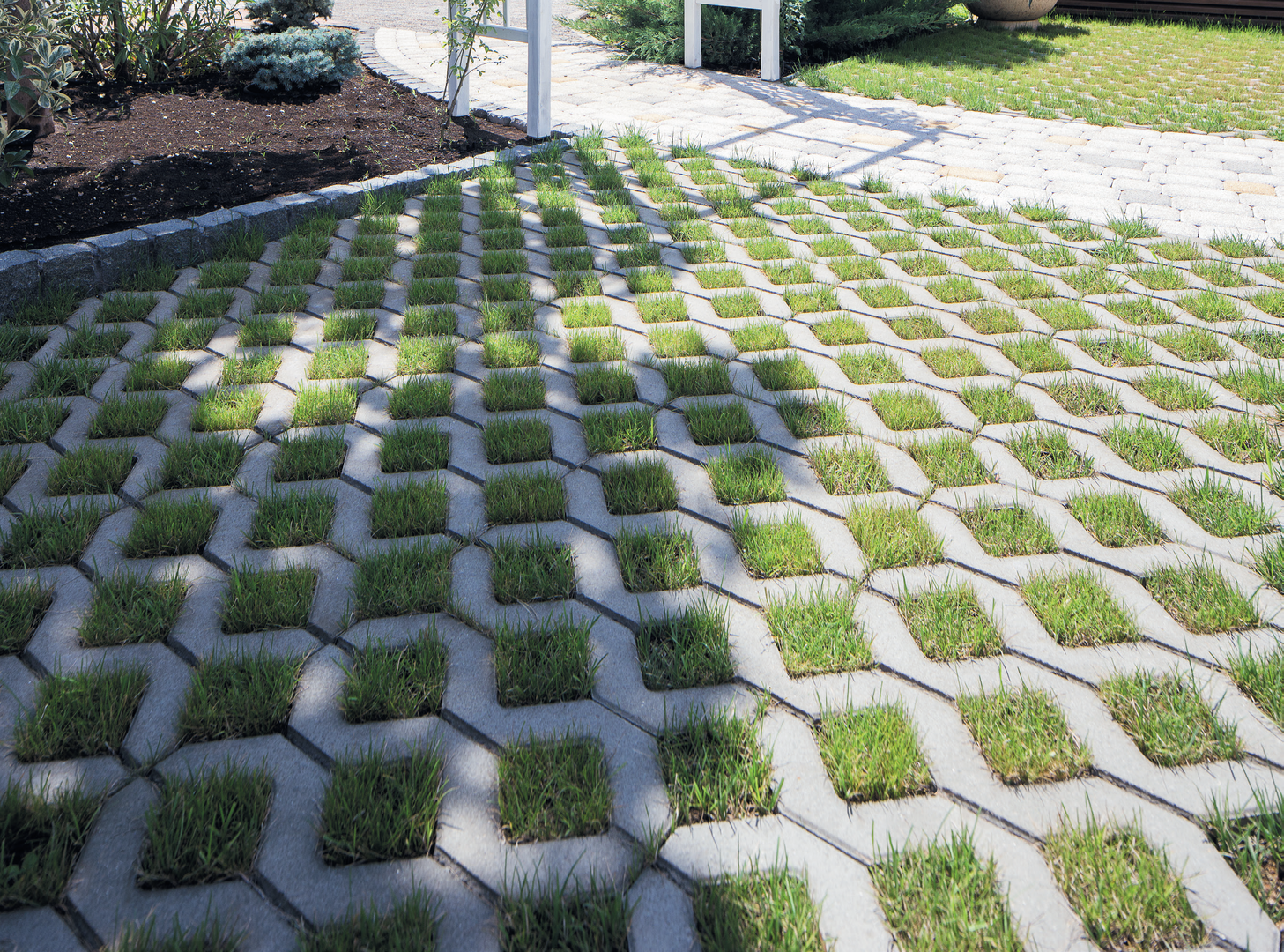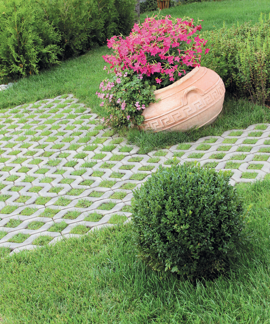 Конструкция решетки состоит из ячеек, которые заполняются грунтом, декоративной щепой или галькой, обеспечивая равномерное распределение нагрузки и свободный рост травы. Такой подход сохраняет зелёный облик территории даже при активной эксплуатации.